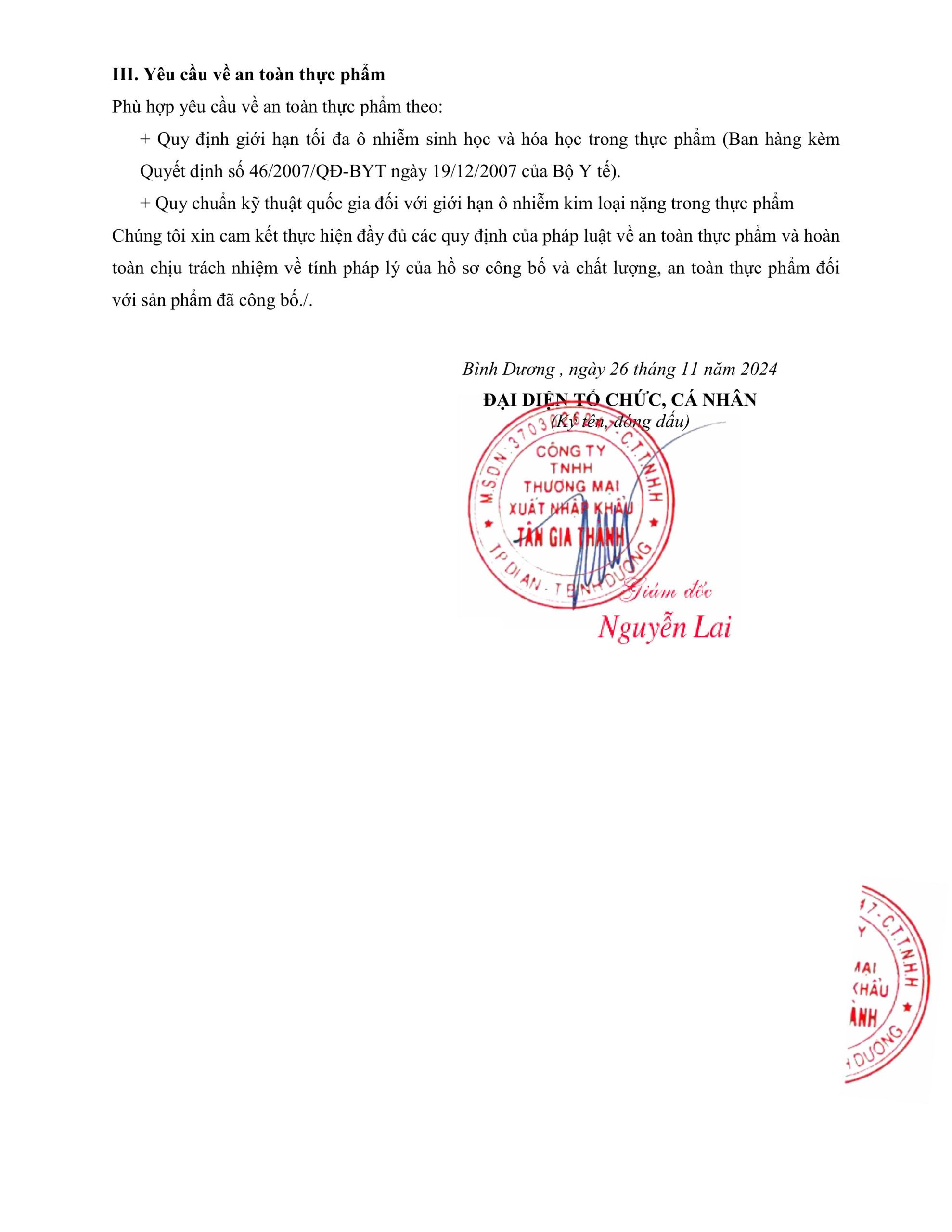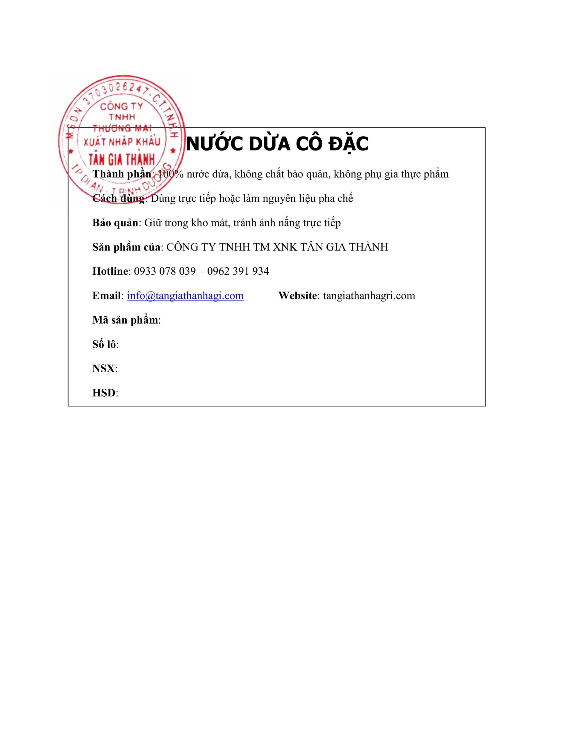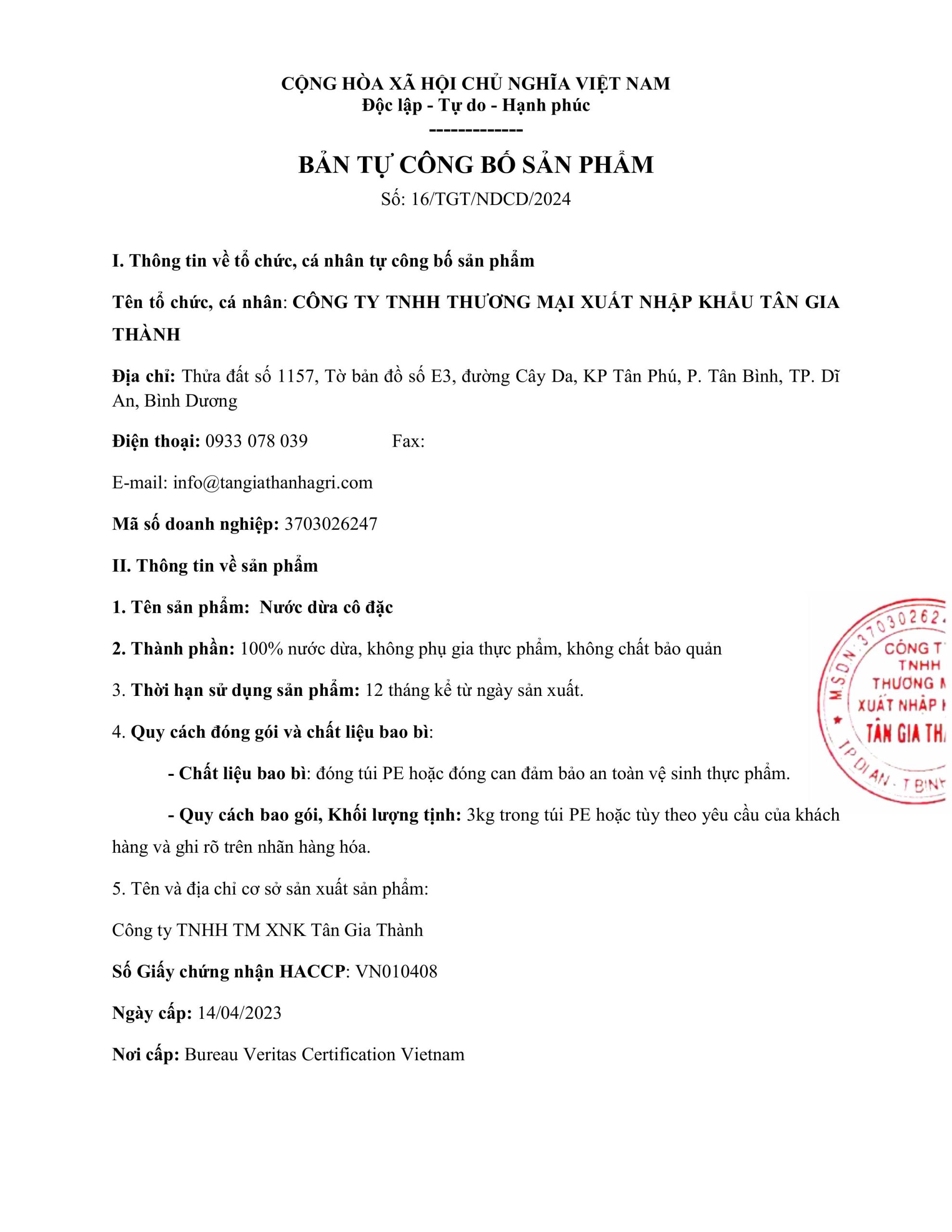 Công bố sản phẩmTỰ CÔNG BỐ SẢN PHẨM NƯỚC DỪA CÔ ĐẶC Siêu thị đông lạnh – Công ty TNHH TM XNK Tân Gia Thành sản xuất và cung cấp nước dừa cô đặc. Dưới đây là bản tự công bố cho sản phẩm nước dừa cô đặc Bản tự công bố sản phẩm nước dừa cô đặc Kết quả kiểm nghiệm Tem sản phẩm Nguồn: STDL